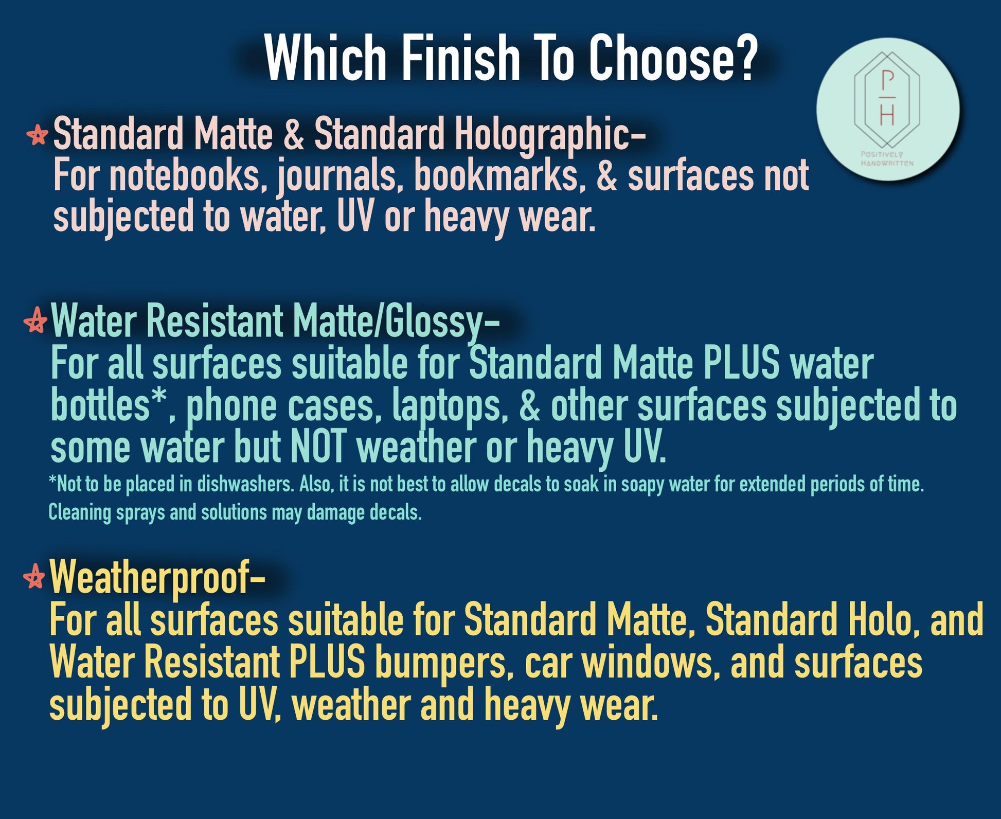 *Weatherproof decals have a buttery finish and are perfect for bumpers, car windows, water bottles, coolers, and any surface that is subjected to water and weather. None of the finishes are dishwasher safe.
